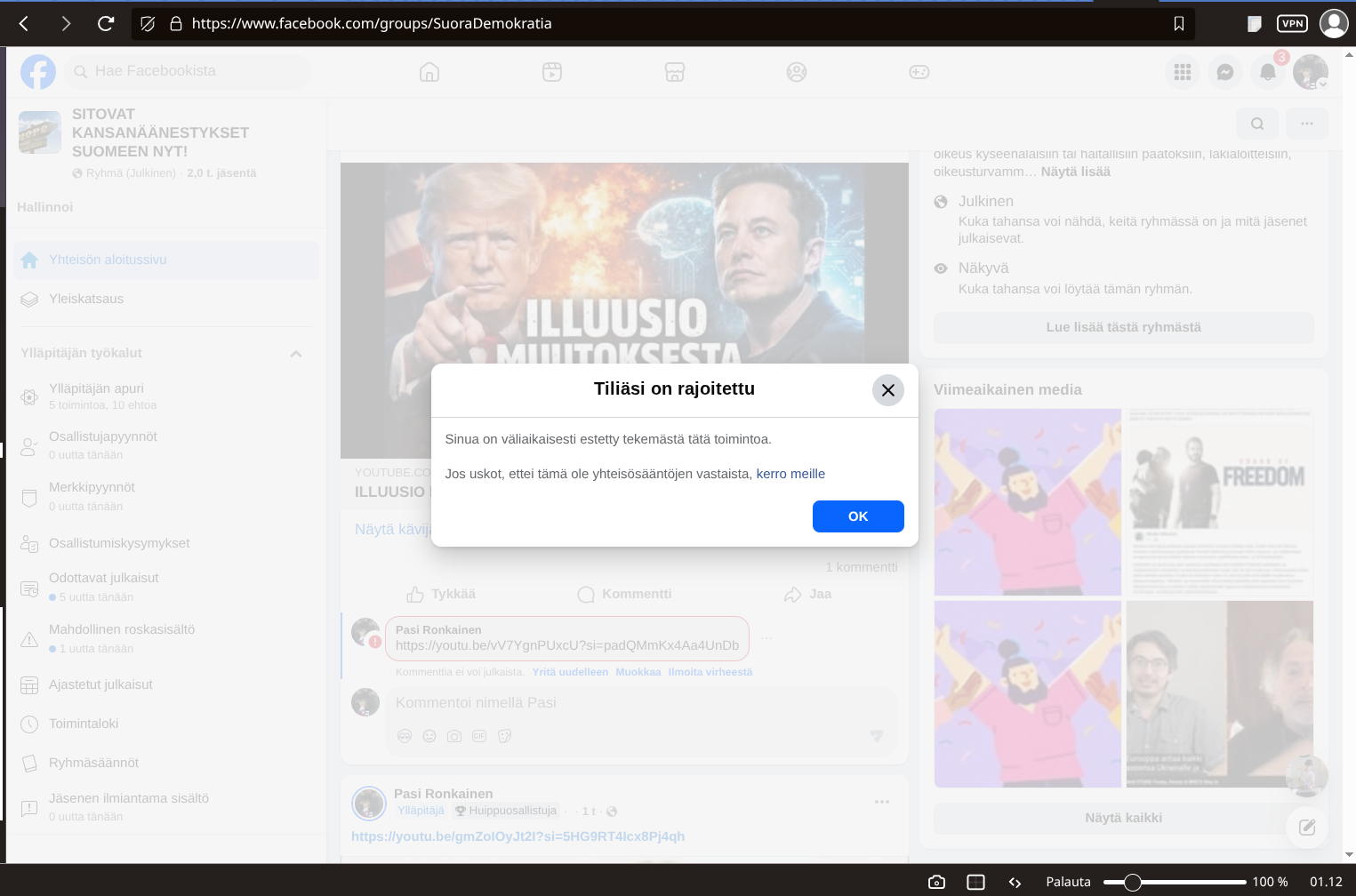 No artikkelin kuvana on kuvankaappaus tästä Facebookin toimenpiteestä, jossa se vain ilmoittaa minulle että minua on väliaikaisesti estetty -> KERTOMATTA MITÄ YHTEISÖSÄÄNTÖÄ TÄMÄ NYT SITTEN MAHDOLLISESTI RIKKOI JA MIKSI?